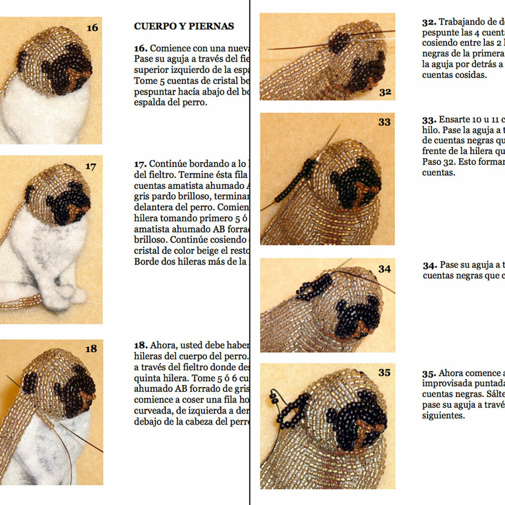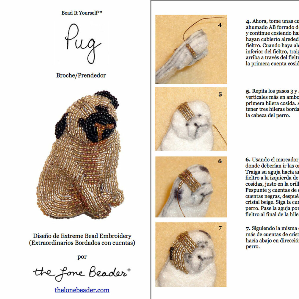PDF en español: PUG patrón de bordado con cuentas de prendedor de perro + Tutorial de Introducción a Básico Bordados con Cuentas