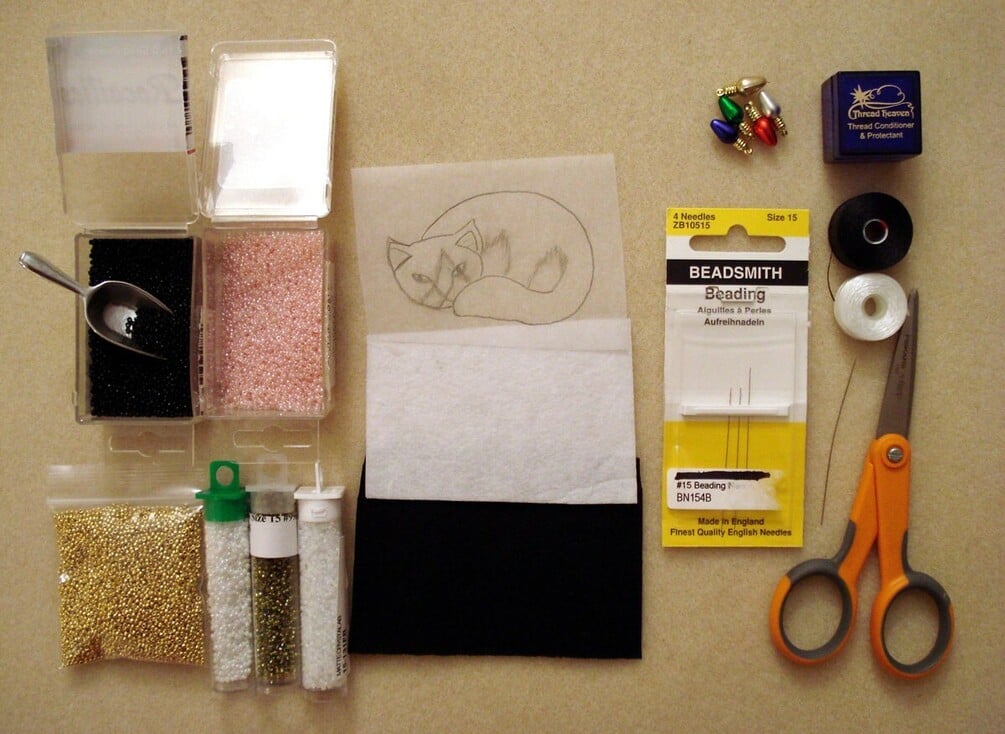 Aprenda el arte del bordado con cuentas! El bordado con cuentas es el arte de coser con cuentas de cristal sobre fieltro usando hilo y aguja. Aprende paso a paso el bordado básico con cuentas de cristal en ésta clase maestra. Este no es un kit o paquete de bordado, tampoco un patrón o molde de cuenta por cuenta, pero el archivo sí incluye un dibujo del gato que utilizamos en el proyecto de bordado, el cual puede utilizar para practicar sus bordados. Este tutorial le enseñará como realizar la técnica de pespunte o puntada de vuelta, así como instrucciones para poner capas de bordado de cuentas con márgenes. (Este tutorial no trata de diseños colocando diversas capas de fieltro o tela.) Este tutorial lo motivará a intentar crear sus propios bordados con cuentas, joyería y arte, así como para brindarle ideas sobre mis diferentes técnicas. Espero que este tutorial le inspire a realizar sus propios bordados con cuentas!