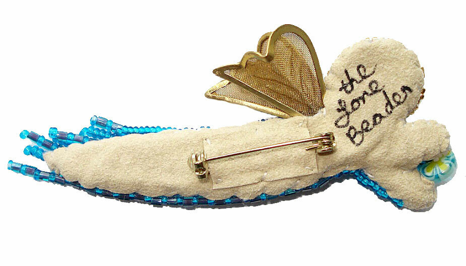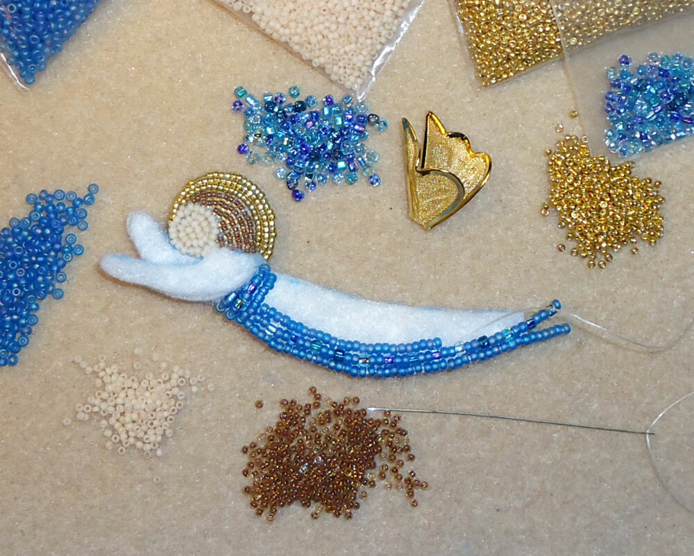 You will need size 15/0 seed beads in 3 different colors, 11/0 seed beads, 1 small Millefiori bead, angel wing charms or appliques, felt, Ultrasuede, beading needles, Nymo thread, one pin back, glue, and a little patience to complete this piece:)